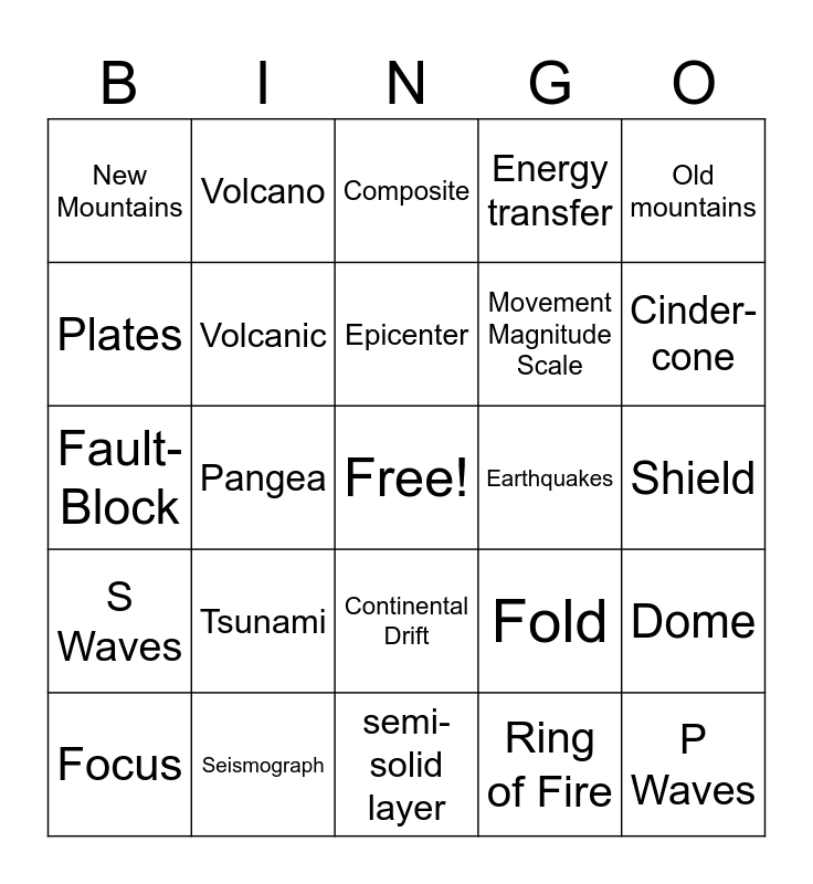 This bingo card has a free space and 24 words: Tsunami, Seismograph, Epicenter, Focus, Old mountains, New Mountains, Plates, Volcano, Earthquakes, Continental Drift, Movement Magnitude Scale, Fault-Block, Fold, Dome, Volcanic, Ring of Fire, Shield, Composite, Cinder-cone, Pangea, P Waves, S Waves, Energy transfer and semi-solid layer.