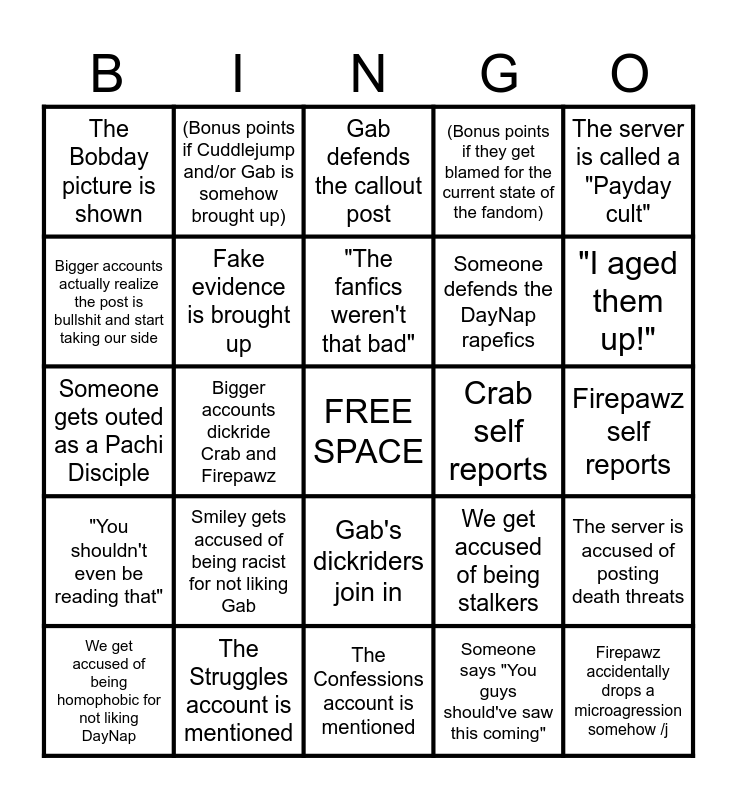 This bingo card has a free space and 24 words: We get accused of being homophobic for not liking DayNap, Smiley gets accused of being racist for not liking Gab, "The fanfics weren't that bad", Someone says "You guys should've saw this coming", The server is called a "Payday cult", The Bobday picture is shown, (Bonus points if Cuddlejump and/or Gab is somehow brought up), Gab defends the callout post, Crab self reports, Firepawz self reports, Someone gets outed as a Pachi Disciple, Fake evidence is brought up, We get accused of being stalkers, The server is accused of posting death threats, Bigger accounts actually realize the post is bullshit and start taking our side, The Struggles account is mentioned, The Confessions account is mentioned, (Bonus points if they get blamed for the current state of the fandom), "I aged them up!", "You shouldn't even be reading that", Bigger accounts dickride Crab and Firepawz, Gab's dickriders join in, Someone defends the DayNap rapefics and Firepawz accidentally drops a microagression somehow /j.