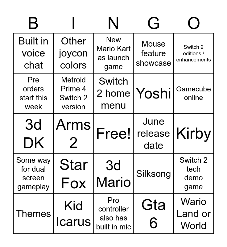 This bingo card has a free space and 24 words: Star Fox, Kid Icarus, Switch 2 home menu, Themes, Switch 2 editions / enhancements, Built in voice chat, Pre orders start this week, Other joycon colors, June release date, 3d Mario, Yoshi, 3d DK, Silksong, Switch 2 tech demo game, Metroid Prime 4 Switch 2 version, Gta 6, Kirby, New Mario Kart as launch game, Gamecube online, Arms 2, Wario Land or World, Some way for dual screen gameplay, Mouse feature showcase and Pro controller also has built in mic.