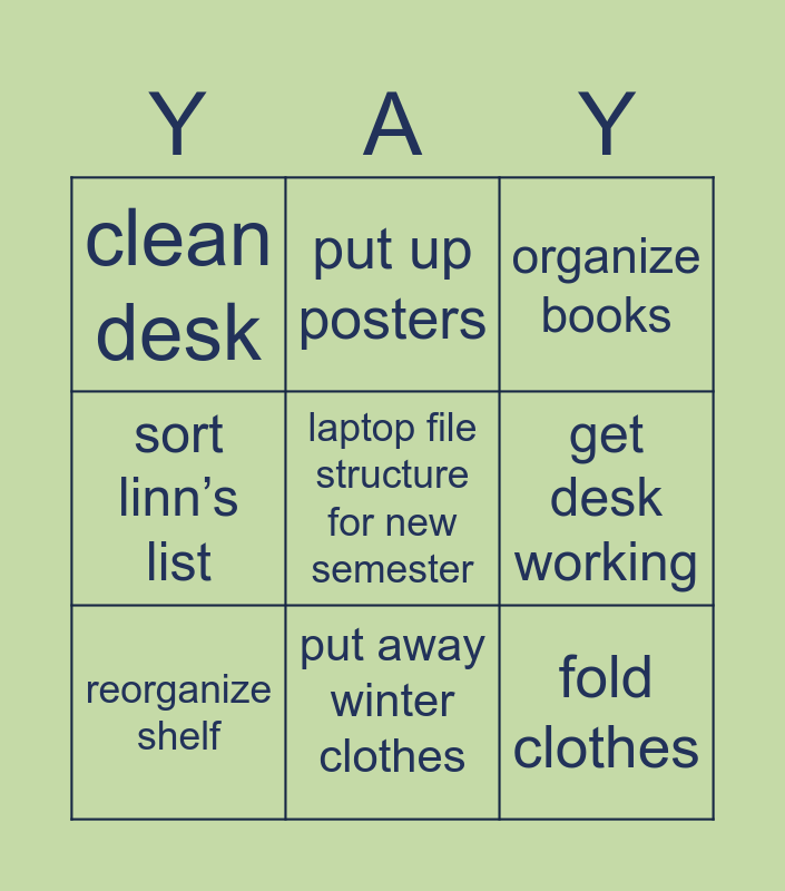 This bingo card has 9 words: reorganize shelf, organize books, put up posters, sort linn’s list, clean desk, get desk working, laptop file structure for new semester, fold clothes and put away winter clothes.