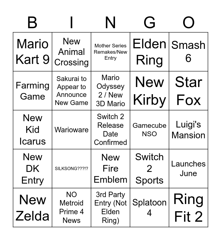This bingo card has a free space and 24 words: SILKSONG???!?, NO Metroid Prime 4 News, Mario Odyssey 2 / New 3D Mario, New Zelda, Smash 6, Mario Kart 9, Farming Game, New Animal Crossing, Gamecube NSO, New Fire Emblem, New Kirby, New Kid Icarus, Switch 2 Sports, Launches June, Sakurai to Appear to Announce New Game, Splatoon 4, Luigi's Mansion, Mother Series Remakes/New Entry, Star Fox, Warioware, Ring Fit 2, New DK Entry, Elden Ring and 3rd Party Entry (Not Elden Ring).