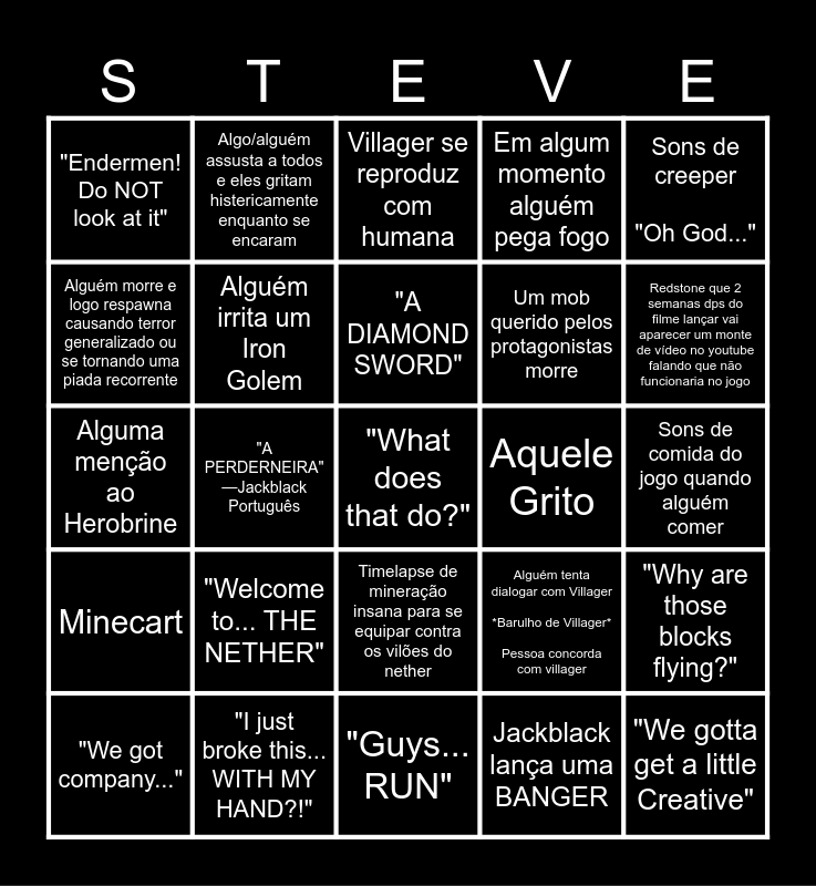 This bingo card has 25 words: "Welcome to... THE NETHER", "Guys... RUN", "A DIAMOND SWORD", "We got company...", Sons de creeper "Oh God...", "Endermen! Do NOT look at it", Alguém morre e logo respawna causando terror generalizado ou se tornando uma piada recorrente, Algo/alguém assusta a todos e eles gritam histericamente enquanto se encaram, Aquele Grito, Timelapse de mineração insana para se equipar contra os vilões do nether, Um mob querido pelos protagonistas morre, Alguma menção ao Herobrine, Alguém tenta dialogar com Villager *Barulho de Villager* Pessoa concorda com villager, "Why are those blocks flying?", Alguém irrita um Iron Golem, "We gotta get a little Creative", Sons de comida do jogo quando alguém comer, Villager se reproduz com humana, Redstone que 2 semanas dps do filme lançar vai aparecer um monte de vídeo no youtube falando que não funcionaria no jogo, "A PERDERNEIRA" —Jackblack Português, "What does that do?", "I just broke this... WITH MY HAND?!", Minecart, Em algum momento alguém pega fogo and Jackblack lança uma BANGER.