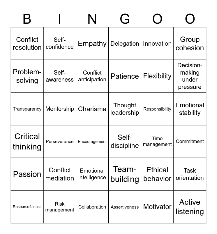 This bingo card has 80 words: Free!, Social skills, Empathy, Decision-making, Visionary, Clear communicator, Motivator, Integrity, Assertiveness, Adaptability, Emotional intelligence, Accountability, Delegation, Conflict resolution, Risk-taking, Group cohesion, Task orientation, Responsibility, Trust-building, Charisma, Collaboration, Innovation, Flexibility, Self-awareness, Problem-solving, Creativity, Persuasiveness, Compassion, Listening skills, Honesty, Patience, Humility, Time management, Passion, Encouragement, Mentorship, Supportiveness, Objectivity, Risk management, Transparency, Conflict mediation, Optimism, Initiative, Recognition, Resourcefulness, Self-confidence, Team-building, Ethical behavior, Resilience, Planning, Perseverance, Decision-making under pressure, Critical thinking, Professionalism, Diplomacy, Influence, Active listening, Goal setting, Motivational speaking, Emotional stability, Conflict anticipation, Change management, Goal orientation, Competence, Reliability, Dependability, Authority, Tactical thinking, Inspiration, Focus, Thought leadership, Self-discipline, Vision setting, Authenticity, Courage, Openness to feedback, Commitment, Fairness, Self-regulation and Facilitation skills.
