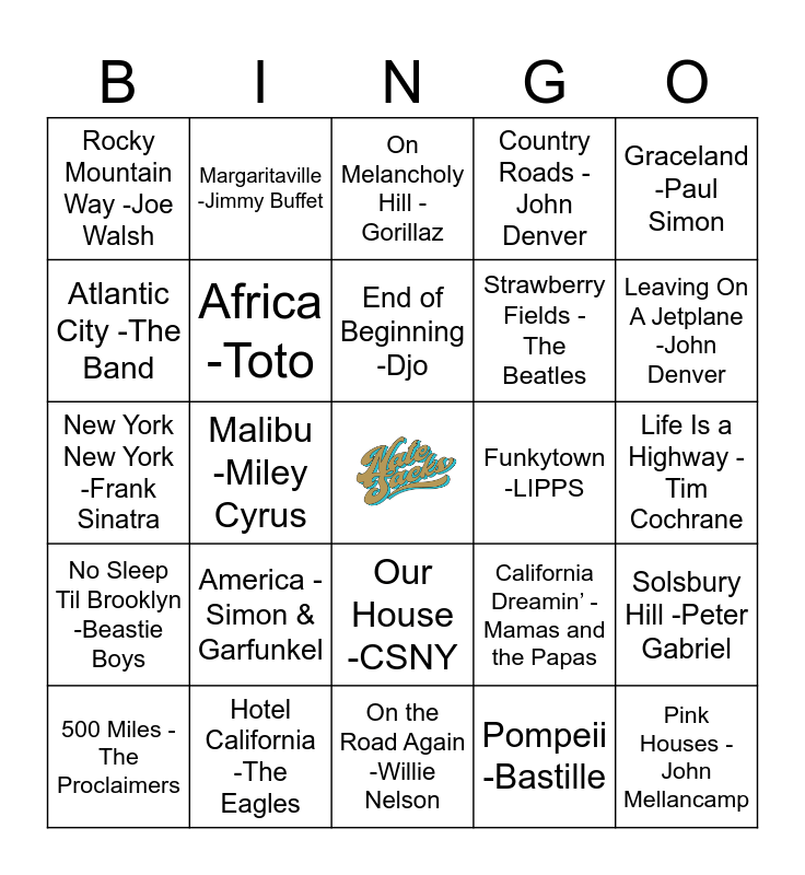 This bingo card has a free space and 40 words: Budapest -George Ezra, New York New York -Frank Sinatra, Ventura Highway -America, Africa -Toto, Hotel California -The Eagles, Our House -CSNY, End of Beginning -Djo, Montana -Frank Zappa, Graceland -Paul Simon, No Sleep Til Brooklyn -Beastie Boys, Malibu -Miley Cyrus, Country Roads -John Denver, Pink Houses -John Mellancamp, Life Is a Highway -Tim Cochrane, Funkytown -LIPPS, America -Simon & Garfunkel, California -Led Zeppelin, Rocky Mountain Way -Joe Walsh, London Calling -The Clash, On Melancholy Hill -Gorillaz, Solsbury Hill -Peter Gabriel, Pompeii -Bastille, Strawberry Fields -The Beatles, Atlantic City -The Band, Carolina In My Mind -James Taylor, Californication -Red Hot Chili Peppers, Beverly Hills -Weezer, Tennessee Whiskey -Chris Stapleton, Cruise -Florida Georgia Line, Wagon Wheel -Old Crow Medicine Show, Willin’ -Little Feat, 500 Miles - The Proclaimers, I Can See For Miles -The Who, California Dreamin’ - Mamas and the Papas, Leaving On A Jetplane -John Denver, On the Road Again -Willie Nelson, Sweet Home Alabama -Lynyrd Skynyrd, Brazil -Declan McKenna, Margaritaville -Jimmy Buffet and New Speedway Boogie - Grateful Dead.
