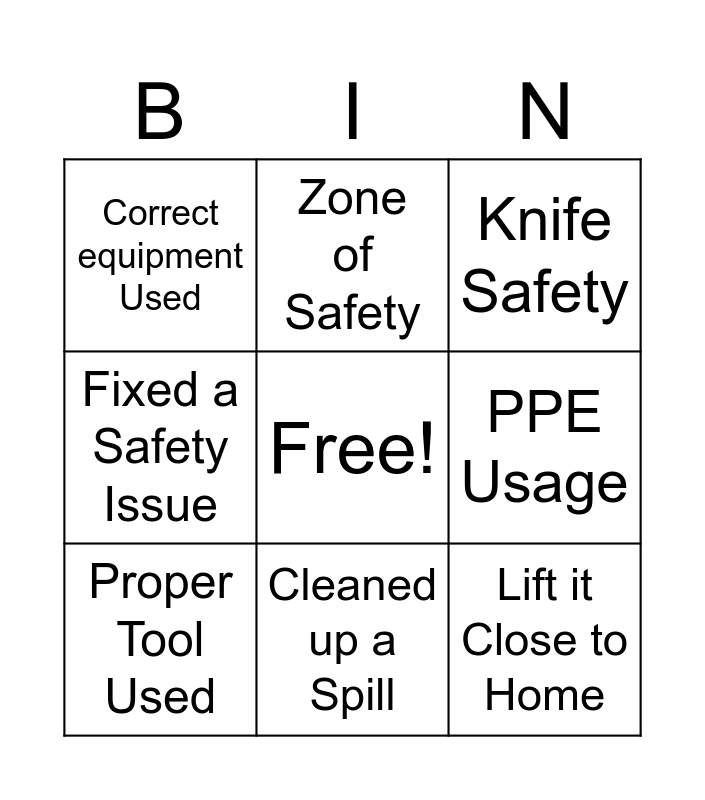 This bingo card has a free space and 8 words: PPE Usage, Knife Safety, Zone of Safety, Proper Tool Used, Correct equipment Used, Lift it Close to Home, Fixed a Safety Issue and Cleaned up a Spill.