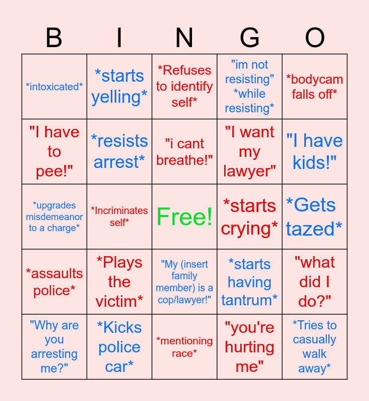 This bingo card has a free space and 24 words: *Plays the victim*, *Kicks police car*, "i cant breathe!", "Why are you arresting me?", *bodycam falls off*, *intoxicated*, "I have to pee!", *starts yelling*, *starts crying*, "My (insert family member) is a cop/lawyer!", "I want my lawyer", *upgrades misdemeanor to a charge*, *starts having tantrum*, "what did I do?", *resists arrest*, "you're hurting me", *Gets tazed*, *Refuses to identify self*, "I have kids!", *Incriminates self*, *Tries to casually walk away*, *assaults police*, "im not resisting" *while resisting* and *mentioning race*.