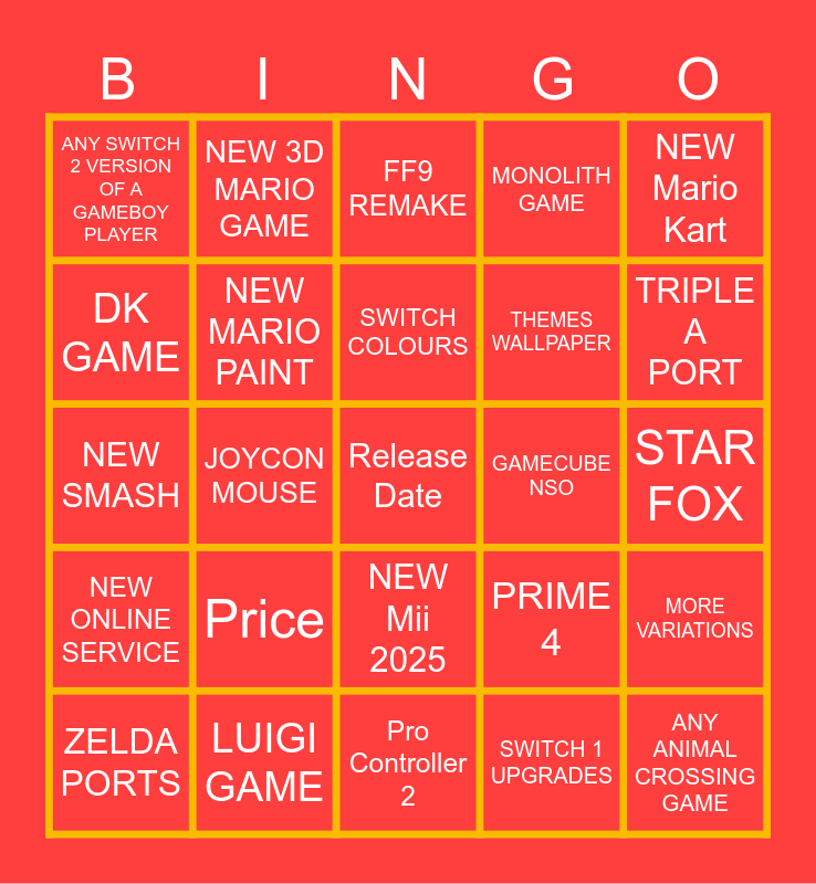 This bingo card has a free space and 24 words: Price, LUIGI GAME, SWITCH COLOURS, ZELDA PORTS, NEW Mario Kart, ANY SWITCH 2 VERSION OF A GAMEBOY PLAYER, DK GAME, NEW 3D MARIO GAME, GAMECUBE NSO, NEW Mii 2025, THEMES WALLPAPER, NEW SMASH, PRIME 4, MORE VARIATIONS, NEW MARIO PAINT, SWITCH 1 UPGRADES, STAR FOX, FF9 REMAKE, TRIPLE A PORT, JOYCON MOUSE, ANY ANIMAL CROSSING GAME, NEW ONLINE SERVICE, MONOLITH GAME and Pro Controller 2.