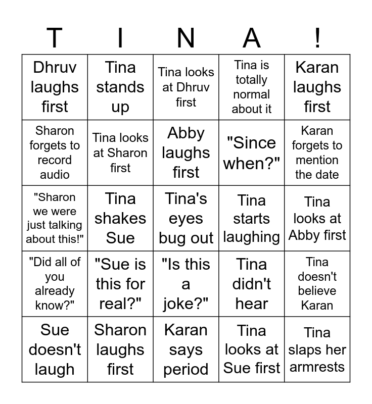 This bingo card has a free space and 24 words: "Sue is this for real?", Sharon laughs first, Abby laughs first, Sue doesn't laugh, Karan laughs first, Dhruv laughs first, Sharon forgets to record audio, Tina stands up, Tina starts laughing, "Is this a joke?", "Since when?", "Sharon we were just talking about this!", Tina didn't hear, Tina doesn't believe Karan, Tina looks at Sharon first, Tina looks at Sue first, Tina looks at Abby first, Tina looks at Dhruv first, Karan forgets to mention the date, Tina shakes Sue, Tina slaps her armrests, "Did all of you already know?", Tina is totally normal about it and Karan says period.