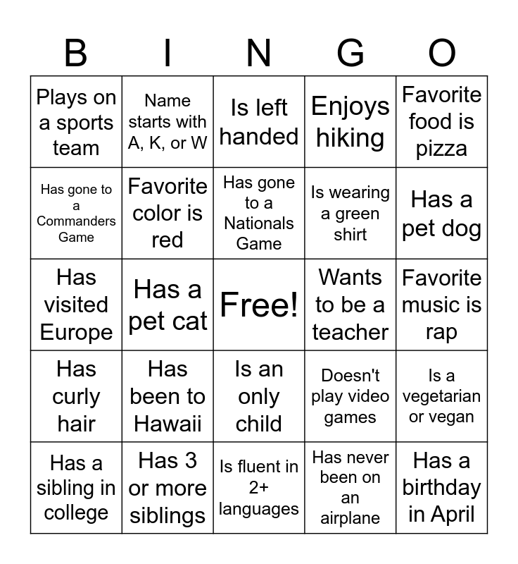 This bingo card has a free space and 24 words: Has been to Hawaii, Has 3 or more siblings, Has gone to a Nationals Game, Has a sibling in college, Favorite food is pizza, Plays on a sports team, Has gone to a Commanders Game, Name starts with A, K, or W, Wants to be a teacher, Is an only child, Is wearing a green shirt, Has visited Europe, Doesn't play video games, Is a vegetarian or vegan, Favorite color is red, Has never been on an airplane, Favorite music is rap, Is left handed, Has a pet dog, Has a pet cat, Has a birthday in April, Has curly hair, Enjoys hiking and Is fluent in 2+ languages.