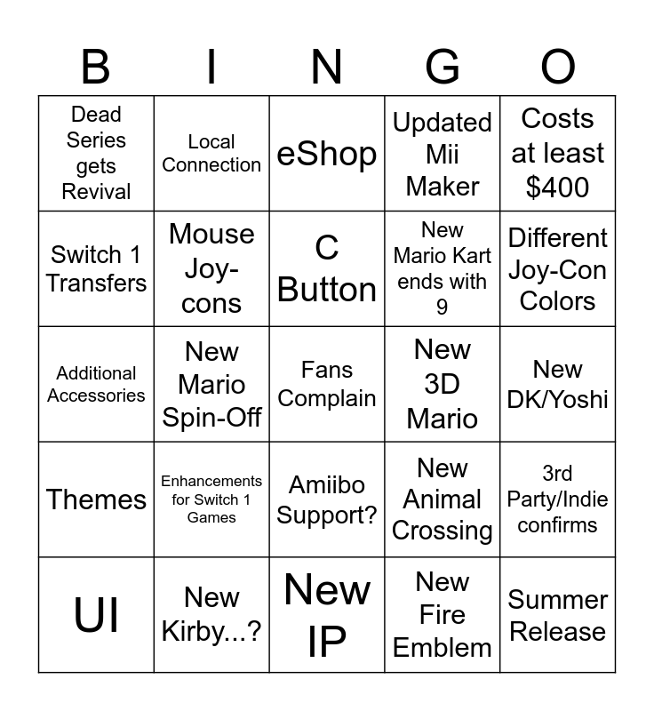 This bingo card has a free space and 24 words: Enhancements for Switch 1 Games, New Kirby...?, C Button, UI, Costs at least $400, Dead Series gets Revival, Switch 1 Transfers, Local Connection, New 3D Mario, Amiibo Support?, New Mario Kart ends with 9, Additional Accessories, New Animal Crossing, 3rd Party/Indie confirms, Mouse Joy-cons, New Fire Emblem, New DK/Yoshi, eShop, Different Joy-Con Colors, New Mario Spin-Off, Summer Release, Themes, Updated Mii Maker and New IP.
