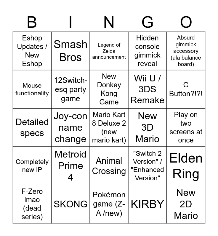 This bingo card has a free space and 24 words: Metroid Prime 4, SKONG, New Donkey Kong Game, F-Zero lmao (dead series), Absurd gimmick accessory (ala balance board), Eshop Updates / New Eshop, Mouse functionality, Smash Bros, New 3D Mario, Animal Crossing, Wii U / 3DS Remake, Detailed specs, "Switch 2 Version" / "Enhanced Version", Elden Ring, 12Switch-esq party game, KIRBY, Play on two screens at once, Legend of Zelda announcement, C Button?!?!, Joy-con name change, New 2D Mario, Completely new IP, Hidden console gimmick reveal and Pokémon game (Z-A /new).