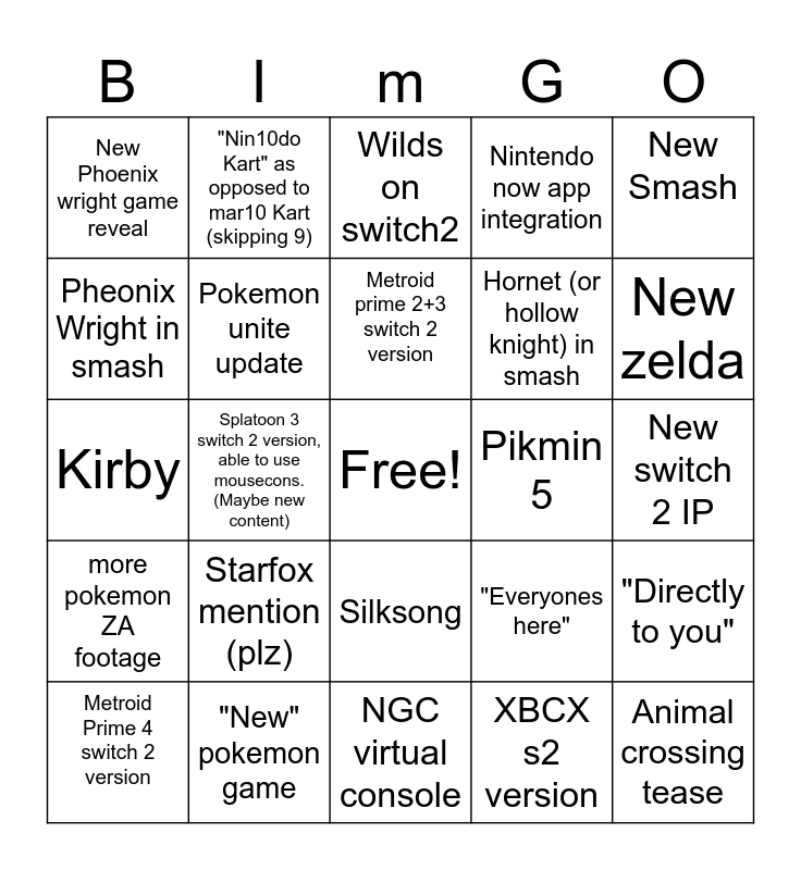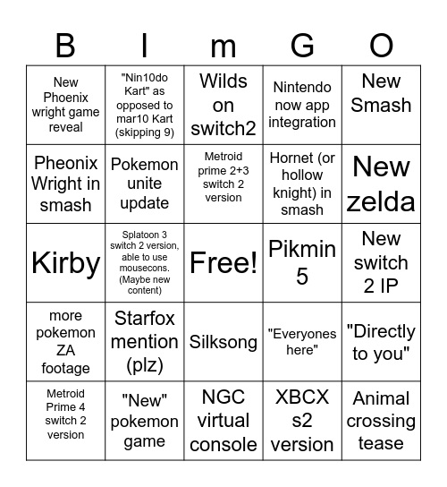 This bingo card has a free space and 24 words: Starfox mention (plz), "New" pokemon game, Metroid prime 2+3 switch 2 version, Metroid Prime 4 switch 2 version, New Smash, New Phoenix wright game reveal, Pheonix Wright in smash, "Nin10do Kart" as opposed to mar10 Kart (skipping 9), Pikmin 5, Silksong, Hornet (or hollow knight) in smash, Kirby, "Everyones here", "Directly to you", Pokemon unite update, XBCX s2 version, New switch 2 IP, Wilds on switch2, New zelda, Splatoon 3 switch 2 version, able to use mousecons. (Maybe new content), Animal crossing tease, more pokemon ZA footage, Nintendo now app integration and NGC virtual console.