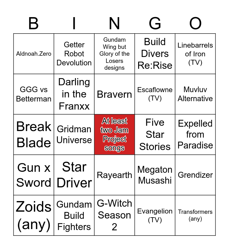 This bingo card has a free space and 24 words: Star Driver, Gundam Build Fighters, Bravern, Zoids (any), Linebarrels of Iron (TV), Aldnoah.Zero, GGG vs Betterman, Getter Robot Devolution, Five Star Stories, Rayearth, Escaflowne (TV), Break Blade, Megaton Musashi, Grendizer, Darling in the Franxx, Evangelion (TV), Expelled from Paradise, Gundam Wing but Glory of the Losers designs, Muvluv Alternative, Gridman Universe, Transformers (any), Gun x Sword, Build Divers Re:Rise and G-Witch Season 2.