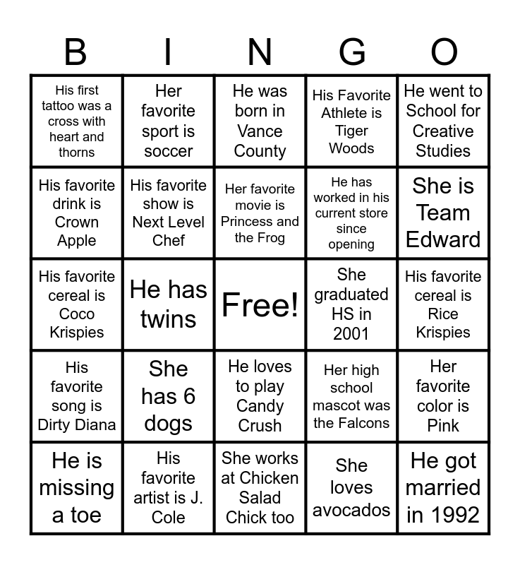 This bingo card has a free space and 49 words: His favorite drink is whole milk, He got married in 1992, He played the recorder in school, She works at Chicken Salad Chick too, She has 6 dogs, His favorite movie is Dumbo, Her favorite sport is soccer, Her shoe size is 8, His favorite drink is Crown Apple, He's a huge Michael Jackson fan, His favorite show is Next Level Chef, His Favorite Athlete is Tiger Woods, Her favorite color is Pink, Her high school mascot was the Falcons, He is allergic to cats, His favorite game is Call of Duty, Her favorite movie is Princess and the Frog, She graduated HS in 2001, His favorite sport is golf, He went to School for Creative Studies, He has twins, She loves avocados, His first tattoo was a cross with heart and thorns, He has worked in his current store since opening, His favorite family member is his son., She is Team Edward, He is missing a toe, He's a huge Auburn fan, He loves to play Candy Crush, His favorite song is Dirty Diana, His HS mascot was a Trojan, Her hidden talent is baking, Her daughter also works for City BBQ, He has 2 children, His favorite artist is J. Cole, She loves BTS, His favorite drink is extra strong black coffee, He is cheering for Duke in the NCAA, His favorite cereal is Rice Krispies, His favorite food is Turkey, Her favorite car is a Mustang, She wanted to be a lawyer when she was a kid, Her favorite animal is a turle, The best concert he saw was Led Zeplin, His favorite cereal is Coco Krispies, He was born in Vance County, His brother is his favorite family member, He hates country music and She loves Drake.