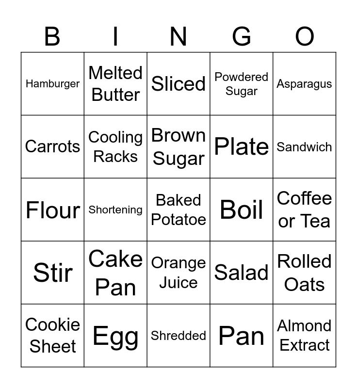 This bingo card has 124 words: Butter, Bake, Simmer, Stir, Mix, Chop, Stir, Oil, Pan, Mixing Bowl, Bowl, Set Aside, 350 Degrees, 375 Degrees, Fold, Blend, Egg, Baking Powder, Baking Soda, Vanilla Extract, Almond Extract, Flour, Coconut Flour, Cake Flour, Granulated Sugar, Brown Sugar, Powdered Sugar, Chocolate Chips, Coco Powder, Egg, Rolled Oats, Lard, Shortening, Cake Pan, Pie Plate, Pot, Fry Pan, Broth, Chicken, Beef, Hamburger, Noodles/Pasta, Corn, Peas, Green Beans, Broccoli, Cauliflower, Asparagus, Potatoe, Corn Syrup, Beaten Egg, Marinate, Toast, Cool Down, Peel, Diced, Chopped, Sauté, Simmer, Boil, Carrots, Celery, Lettuce, Bacon, Mayo, Ranch Dressing, Milk, Orange Juice, Water, Coffee or Tea, Mixer, Heavy Cream, Whipped Cream, 1/4 teaspoons, 1/2 Tablespoon, 1/3 Cup, 3/4 Cup, 2 1/2 Cups, 1/2 Teaspoon, 1/8 Teaspoon, 1 Tablespoon, Sifted, Rolled Oats, Cookie Sheet, Cooling Racks, Salt, Pepper, Cinnamon, Parsley, Onion, Graham Cracker, Crushed, Stir, Boil, Sliced, Shredded, Minced, Greased, Corn Starch, Baked Potatoe, Peanut Butter, Salad, Bread, Dinner Roll, Ice Cream, Preheat, Vinegar, Sandwich, Coated, Set Aside, Oven, Mixer, Cook, Rinse, Whip, Broth, Stir Fry, Guacamole, Plate, Glass, All Spice, Low Heat, Melted Butter and Seasoning Salt.