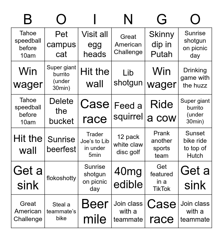 This bingo card has 73 words: Selfie with Gary May, Steal a teammate’s bike, Tahoe speedball before 10am, Join class with a teammate, Ride a cow, Eat a worm, Feed a squirrel, Streak the quad, Hit the wall, Visit all egg heads, Get a sink, Jersey swap (opposite gender), Win wager, Case race, Dartboard bullseye, Pet campus cat, Prank another sports team, Sunrise shotgun on picnic day, Selfie with preacher guy, Delete the bucket, Super giant burrito (under 30min), Great American Challenge, Skinny dip in Putah, flokoshotty, Trader Joe’s to Lib in under 5min, Chirp D1 wlax game, Lib shotgun, 40mg edible, Beer mile, Sleep outside, 12 pack white claw disc golf, Sunrise beerfest, Turkey Call & Response, Win beerio, Drinking game with the huzz, Get featured in a TikTok, Selfie with Gary May, Steal a teammate’s bike, Tahoe speedball before 10am, Join class with a teammate, Sunset bike ride to top of Hutch, Ride a cow, Eat a worm, Feed a squirrel, Streak the quad, Hit the wall, Visit all egg heads, Get a sink, Jersey swap (opposite gender), Win wager, Case race, Dartboard bullseye, Pet campus cat, Prank another sports team, Sunrise shotgun on picnic day, Selfie with preacher guy, Delete the bucket, Super giant burrito (under 30min), Great American Challenge, Skinny dip in Putah, flokoshotty, Trader Joe’s to Lib in under 5min, Chirp D1 wlax game, Lib shotgun, 40mg edible, Beer mile, Sleep outside, 12 pack white claw disc golf, Sunrise beerfest, Turkey Call & Response, Win beerio, Drinking game with the huzz and Get featured in a TikTok.