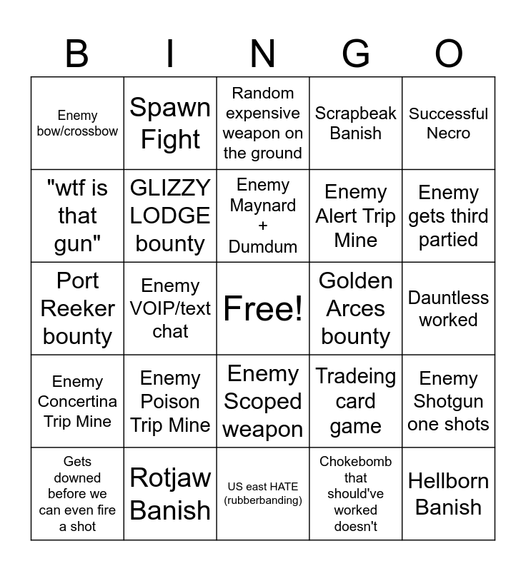 This bingo card has a free space and 63 words: Solo Bounty Banish across the map, Enemy Avtomat, Enemy Nitro Express, Enemy Shotgun one shots, Enemy Wallbang, Banish within 2 minutes, Spawn Fight, Enemy team doubling skins, Enemy Maynard + Dumdum, Enemy Special Ammo, Enemy Scoped weapon, Enemy Melee weapon, Dauntless worked, Successful Necro, Enemy Extract Camping, "wtf is that gun", Enemy VOIP/text chat, Enemy bow/crossbow, Enemy Bug Bomb, Enemy Alert Trip Mine, Enemy Poison Trip Mine, Enemy Concertina Trip Mine, Scrapbeak Banish, Assassin Banish, Butcher Banish, Spider Banish, ghostface spotted, Meathead guarding Clue, Meathead doesn't drop trait spur, random trait spur, Blood Bonds, Hunt Dollars, Hive almost kills one of us, We get third partied, Enemy gets third partied, Gets downed before we can even fire a shot, Out of Choke bombs and teammate is one fire, Chokebomb that should've worked doesn't, Fire that should've burned body doesn't, GLIZZY LODGE bounty, Port Reeker bounty, Golden Arces bounty, Spawn at the bounty, Spawn at Scupper Lake, Hellborn Banish, Rotjaw Banish, Solo leaves the other bounty token behind, Tradeing card game, Gangstalking, person in VC not playing hunt, Arrive at lair and its already red, US east HATE (rubberbanding), bounties still in mission and <5 minutes remaining, Double Clue, Saddlebag gives recov shot/ammo or medic bag, Random expensive weapon on the ground, Enemy Springfield 1888/ Romero 77, Enemy Bomb lance/launcher, One of our health chunks get burned via fire, Enemy Dolch, Enemy double silenced loudout, We step into a bear trap (<3 for Ursa Mortis) and Enviromental animal alerts us to Enemies.
