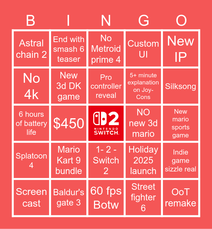 This bingo card has a free space and 24 words: Mario Kart 9 bundle, Baldur's gate 3, Pro controller reveal, Screen cast, New IP, Astral chain 2, No 4k, End with smash 6 teaser, NO new 3d mario, 1- 2 - Switch 2, 5+ minute explanation on Joy-Cons, 6 hours of battery life, Holiday 2025 launch, Indie game sizzle real, New 3d DK game, Street fighter 6, New mario sports game, No Metroid prime 4, Silksong, $450, OoT remake, Splatoon 4, Custom UI and 60 fps Botw.