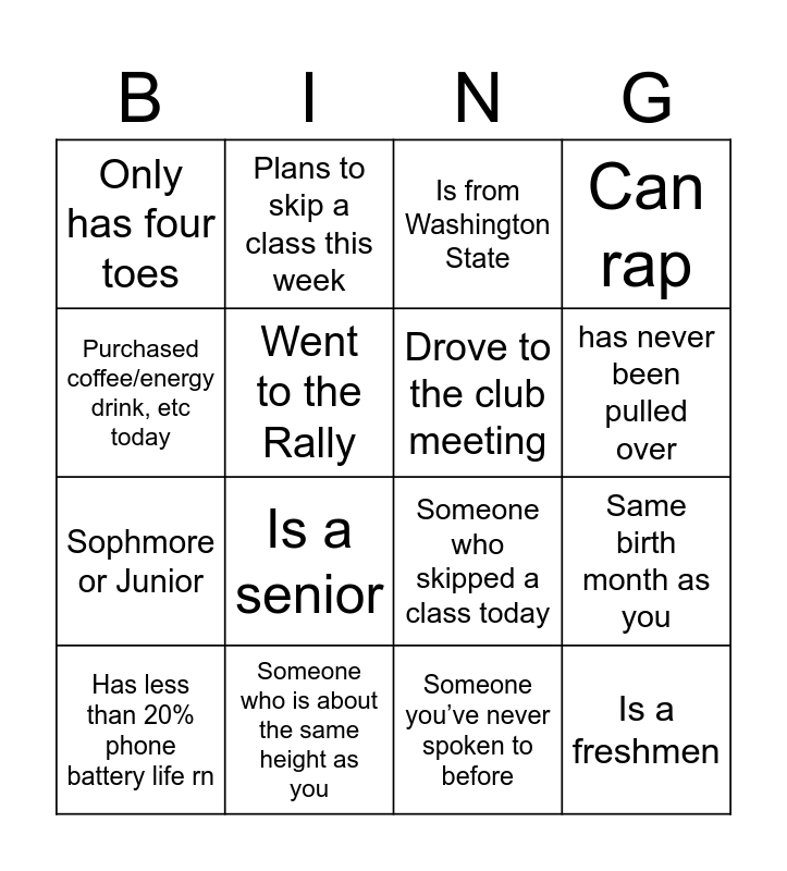 This bingo card has 16 words: Someone who is about the same height as you, Same birth month as you, Is from Washington State, Only has four toes, Sophmore or Junior, Plans to skip a class this week, Someone who skipped a class today, Someone you’ve never spoken to before, Purchased coffee/energy drink, etc today, Went to the Rally, Has less than 20% phone battery life rn, Can rap, Is a senior, has never been pulled over, Drove to the club meeting and Is a freshmen.