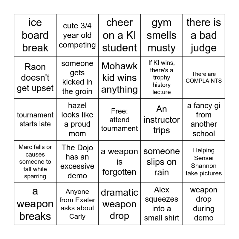 This bingo card has a free space and 34 words: a knife instructor is present, Alex squeezes into a small shirt, STORM practices in the hallway, cartwheels in a sparring match, Marc falls or causes someone to fall while sparring, someone gets kicked in the groin, there is a bad judge, a weapon breaks, cute 3/4 year old competing, Gunnar eats a WHOLE pizza, Mohawk kid wins anything, cheer on a KI student, high five a SWAT member, take a group photo, An instructor trips, There are COMPLAINTS, Anyone from Exeter asks about Carly, tournament starts late, The Dojo has an excessive demo, someone slips on rain, a weapon is forgotten, someone experienced misses their ring, ice board break, a fancy gi from another school, dramatic weapon drop, weapon drop during demo, gym smells musty, Jayden is missing, If KI wins, there's a trophy history lecture, Raon doesn't get upset, badly mispronounced name, hazel looks like a proud mom, Helping Sensei Shannon take pictures and a favorite is chosen by the instructors in sparring.