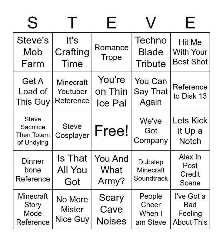 This bingo card has a free space and 40 words: He's Right Behind Me Isn't He?, Steve Sacrifice Then Totem of Undying, Character Named Brian, Minecraft Youtuber Reference, No More Mister Nice Guy, You And What Army?, You're on Thin Ice Pal, Well This Can't Get Any Worse, Hit Me With Your Best Shot, Dinner bone Reference, Steve Cosplayer, Techno Blade Tribute, I've Got a Bad Feeling About This, Lets Kick it Up a Notch, We've Got Company, Is That All You Got, That.... Was Awesome, Steve's Mob Farm, This is The End, Movie then ends, Romance Trope, Alex In Post Credit Scene, People Cheer When I am Steve, You Can Say That Again, Get A Load of This Guy, News Flash Buddy, Dig Straight Down, Item Falls In Lava, Speedrun Reference, Dramatic Death Only to Respawn, Sand or Gravel Falling, Floating Trees, Minecraft Story Mode Reference, Montage, Dubstep Minecraft Soundtrack, Reference to Disk 13, Scary Cave Noises, Someone Puts on Pumpkin, Someone Tries to Sleep in the Nether, It's Crafting Time and This is Minecraft.