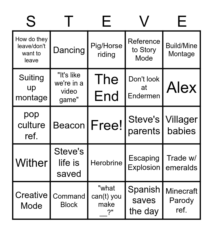 This bingo card has a free space and 24 words: Steve's life is saved, Command Block, The End, Creative Mode, Build/Mine Montage, How do they leave/don't want to leave, Suiting up montage, Dancing, Steve's parents, Herobrine, Don't look at Endermen, pop culture ref., Escaping Explosion, Trade w/ emeralds, "It's like we're in a video game", Spanish saves the day, Villager babies, Pig/Horse riding, Alex, Beacon, Minecraft Parody ref., Wither, Reference to Story Mode and "what can(t) you make __?".