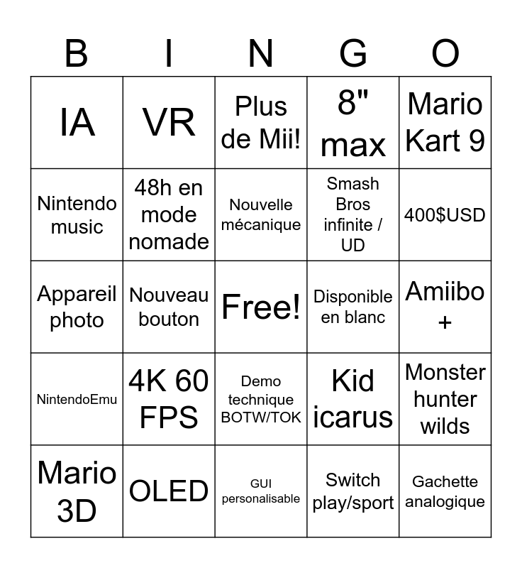 This bingo card has a free space and 24 words: 4K 60 FPS, OLED, Nouvelle mécanique, Mario 3D, Mario Kart 9, IA, Nintendo music, VR, Disponible en blanc, Demo technique BOTW/TOK, Smash Bros infinite / UD, Appareil photo, Kid icarus, Monster hunter wilds, 48h en mode nomade, Switch play/sport, Amiibo +, Plus de Mii!, 400$USD, Nouveau bouton, Gachette analogique, NintendoEmu, 8" max and GUI personalisable.