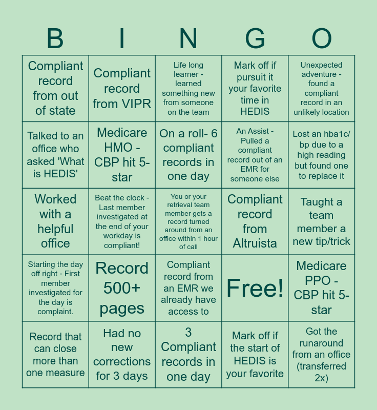 This bingo card has 25 words: Record 500+ pages, 3 Compliant records in one day, On a roll- 6 compliant records in one day, Record that can close more than one measure, Unexpected adventure - found a compliant record in an unlikely location, Compliant record from out of state, Talked to an office who asked 'What is HEDIS', Compliant record from VIPR, Compliant record from Altruista, Compliant record from an EMR we already have access to, An Assist - Pulled a compliant record out of an EMR for someone else, Worked with a helpful office, Free!, Medicare PPO - CBP hit 5-star, Medicare HMO - CBP hit 5-star, Got the runaround from an office (transferred 2x), Taught a team member a new tip/trick, Life long learner - learned something new from someone on the team, Lost an hba1c/ bp due to a high reading but found one to replace it, Beat the clock - Last member investigated at the end of your workday is compliant!, You or your retrieval team member gets a record turned around from an office within 1 hour of call, Had no new corrections for 3 days, Starting the day off right - First member investigated for the day is complaint., Mark off if pursuit it your favorite time in HEDIS and Mark off if the start of HEDIS is your favorite.