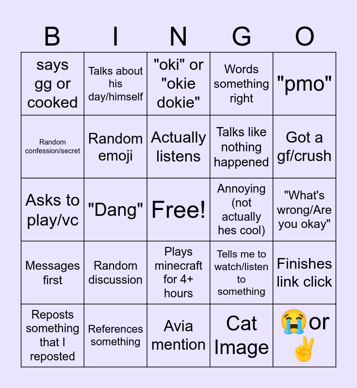 This bingo card has a free space and 24 words: Random discussion, References something, Actually listens, Reposts something that I reposted, "pmo", says gg or cooked, Random confession/secret, Talks about his day/himself, Annoying (not actually hes cool), Plays minecraft for 4+ hours, Talks like nothing happened, Asks to play/vc, Tells me to watch/listen to something, Finishes link click, Random emoji, Cat Image, "What's wrong/Are you okay", "oki" or "okie dokie", Got a gf/crush, "Dang", 😭or ✌, Messages first, Words something right and Avia mention.
