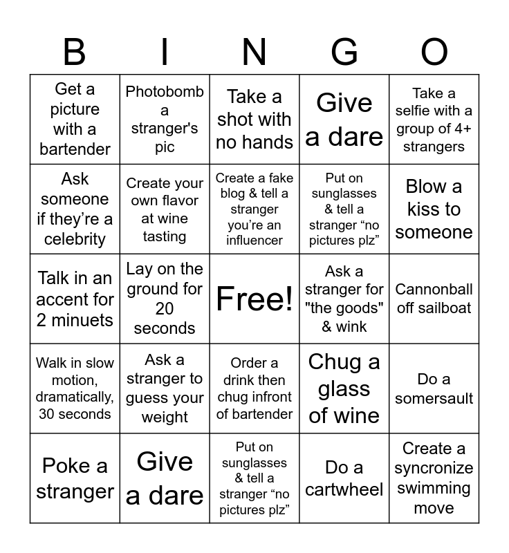 This bingo card has a free space and 24 words: Ask a stranger to guess your weight, Give a dare, Create a fake blog & tell a stranger you’re an influencer, Poke a stranger, Take a selfie with a group of 4+ strangers, Get a picture with a bartender, Ask someone if they’re a celebrity, Photobomb a stranger's pic, Ask a stranger for "the goods" & wink, Order a drink then chug infront of bartender, Put on sunglasses & tell a stranger “no pictures plz”, Talk in an accent for 2 minuets, Chug a glass of wine, Do a somersault, Create your own flavor at wine tasting, Do a cartwheel, Cannonball off sailboat, Take a shot with no hands, Blow a kiss to someone, Lay on the ground for 20 seconds, Create a syncronize swimming move, Walk in slow motion, dramatically, 30 seconds, Give a dare and Put on sunglasses & tell a stranger “no pictures plz”.