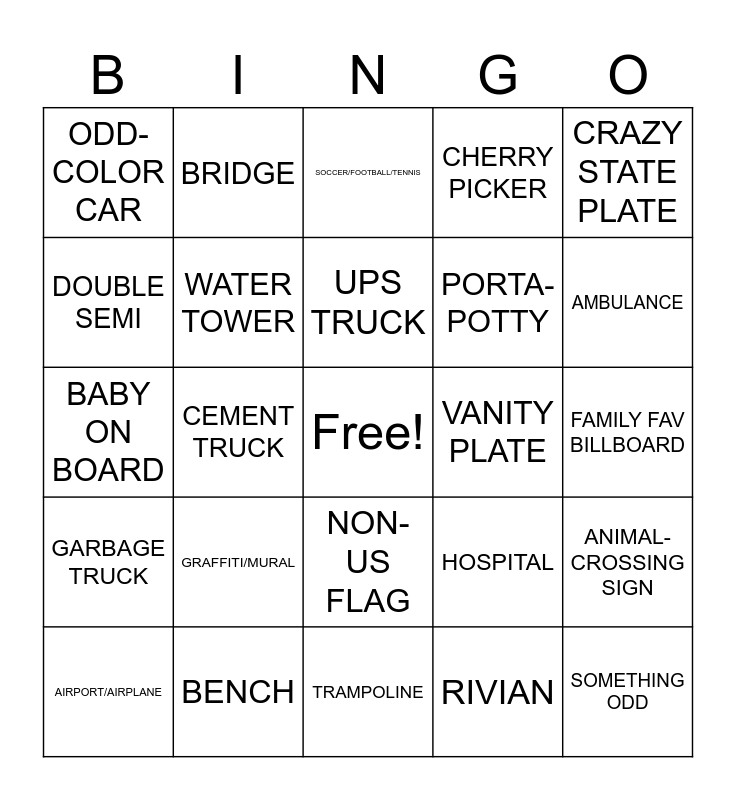 This bingo card has a free space and 76 words: SODA TRUCK, PICNIC TABLE, SOCCER/FOOTBALL/TENNIS, ROADKILL, CUSTOM TESLA, PRIME ELECTRIC, LARGE BIRD, LARGE ANIMAL, BODY OF WATER, BEER BILLBOARD, EMILY TREE, WINDMILL, UPS TRUCK, DOUBLE SEMI, FED EX TRUCK, CEMENT TRUCK, SCHOOL BUS, SOMETHING ODD, RACE CAR, CRAZY STATE PLATE, FUNNY BUMPER STICKER, BABY ON BOARD, WATER TOWER, BRIDGE, CHERRY PICKER, TOW TRUCK, ACCIDENT, CAR ON SHOULDER, SUBWAY, STARBUCKS, TOUR BUS, CHURCH, CEMETERY, HOSPITAL, AMBULANCE, PORTA-POTTY, POLICE CAR, PRESIDENT-NAMED STREET, FAMILY FAV BILLBOARD, RIVIAN, ATLAS, BOAT, WOODEN PALLET, DAMAGED CAR, "MINI" CAR, LADDER, AIRPORT/AIRPLANE, ODD-COLOR CAR, FLASHING ARROW, PLAY SET, CONSTRUCTION CONE, NON-US FLAG, U-HAUL, PERSON ON BICYCLE, KAYAK, RAILROAD CROSSING, SOLAR PANEL/S, TRAILER PARK/CAMP GROUND, NON-RED FIRE HYDRANT, SWIMMING POOL, GRAFFITI/MURAL, RED JEEP, RV, CLEVER BILLBOARD, "Q" HOTEL, HANDWRITTEN SIGN, VANITY PLATE, SPORTS PLATE, TAXI, EMPTY BILLBOARD, ANIMAL-CROSSING SIGN, GARBAGE TRUCK, BENCH, WINDOW STICKER, TRAMPOLINE and FIRE TRUCK.