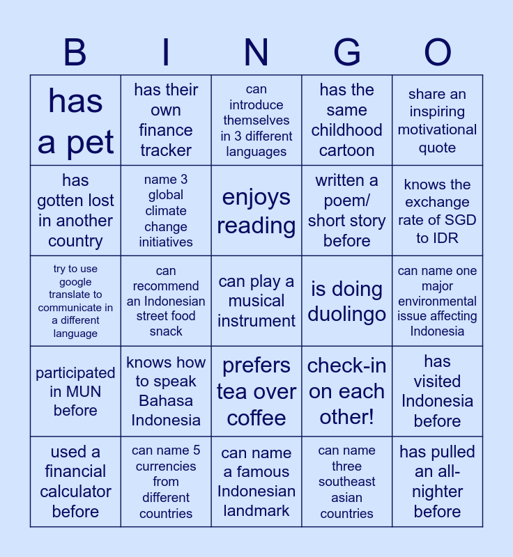 This bingo card has 25 words: knows how to speak Bahasa Indonesia, can name a famous Indonesian landmark, enjoys reading, used a financial calculator before, share an inspiring motivational quote, has a pet, has gotten lost in another country, has their own finance tracker, is doing duolingo, prefers tea over coffee, written a poem/ short story before, try to use google translate to communicate in a different language, check-in on each other!, has visited Indonesia before, name 3 global climate change initiatives, has pulled an all-nighter before, can name one major environmental issue affecting Indonesia, can introduce themselves in 3 different languages, knows the exchange rate of SGD to IDR, can recommend an Indonesian street food snack, can play a musical instrument, can name 5 currencies from different countries, participated in MUN before, has the same childhood cartoon and can name three southeast asian countries.