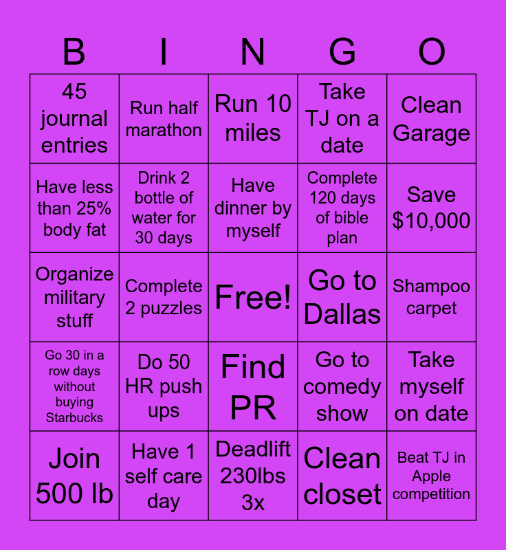 This bingo card has a free space and 24 words: Do 50 HR push ups, Have 1 self care day, Have dinner by myself, Join 500 lb, Clean Garage, 45 journal entries, Have less than 25% body fat, Run half marathon, Go to Dallas, Find PR, Complete 120 days of bible plan, Organize military stuff, Go to comedy show, Take myself on date, Drink 2 bottle of water for 30 days, Clean closet, Shampoo carpet, Run 10 miles, Save $10,000, Complete 2 puzzles, Beat TJ in Apple competition, Go 30 in a row days without buying Starbucks, Take TJ on a date and Deadlift 230lbs 3x.