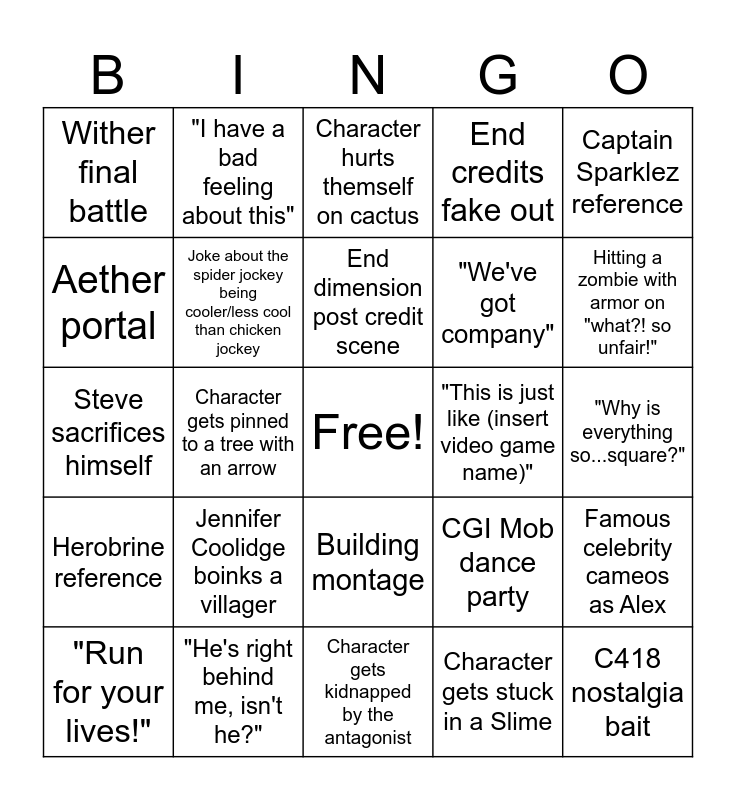 This bingo card has a free space and 24 words: Jennifer Coolidge boinks a villager, "He's right behind me, isn't he?", End dimension post credit scene, "Run for your lives!", Captain Sparklez reference, Wither final battle, Aether portal, "I have a bad feeling about this", "This is just like (insert video game name)", Building montage, "We've got company", Steve sacrifices himself, CGI Mob dance party, Famous celebrity cameos as Alex, Joke about the spider jockey being cooler/less cool than chicken jockey, Character gets stuck in a Slime, "Why is everything so...square?", Character hurts themself on cactus, Hitting a zombie with armor on "what?! so unfair!", Character gets pinned to a tree with an arrow, C418 nostalgia bait, Herobrine reference, End credits fake out and Character gets kidnapped by the antagonist.