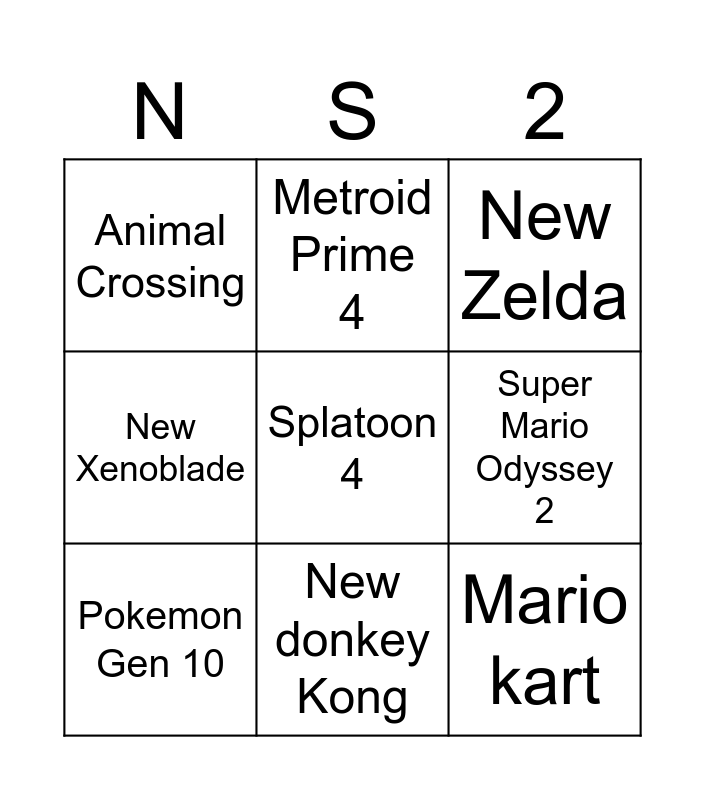 This bingo card has a free space and 8 words: Super Mario Odyssey 2, New Zelda, Metroid Prime 4, Pokemon Gen 10, Animal Crossing, Mario kart, New Xenoblade and New donkey Kong.