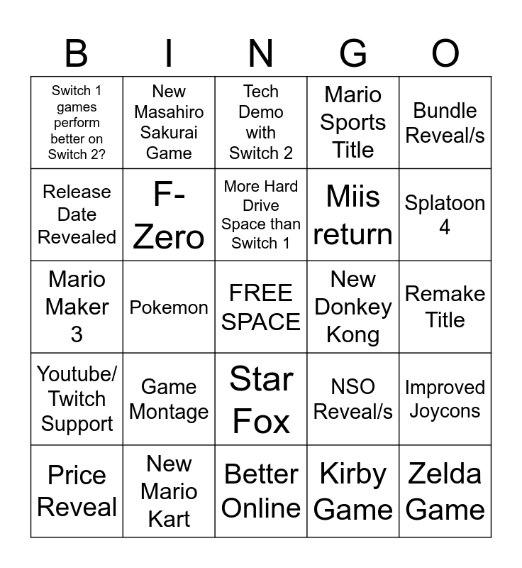 This bingo card has a free space and 24 words: Game Montage, New Mario Kart, More Hard Drive Space than Switch 1, Price Reveal, Bundle Reveal/s, Switch 1 games perform better on Switch 2?, Release Date Revealed, New Masahiro Sakurai Game, New Donkey Kong, Star Fox, Miis return, Mario Maker 3, NSO Reveal/s, Improved Joycons, F-Zero, Kirby Game, Remake Title, Tech Demo with Switch 2, Splatoon 4, Pokemon, Zelda Game, Youtube/ Twitch Support, Mario Sports Title and Better Online.