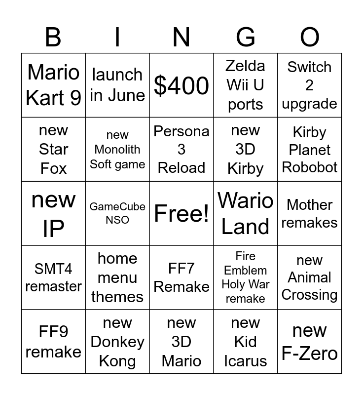 This bingo card has a free space and 24 words: home menu themes, new Donkey Kong, Persona 3 Reload, FF9 remake, Switch 2 upgrade, Mario Kart 9, new Star Fox, launch in June, Wario Land, FF7 Remake, new 3D Kirby, new IP, Fire Emblem Holy War remake, new Animal Crossing, new Monolith Soft game, new Kid Icarus, Mother remakes, $400, Kirby Planet Robobot, GameCube NSO, new F-Zero, SMT4 remaster, Zelda Wii U ports and new 3D Mario.