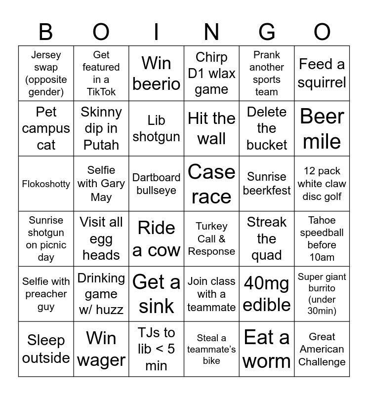 This bingo card has 36 words: Join class with a teammate, Get a sink, Steal a teammate’s bike, Pet campus cat, Sunrise shotgun on picnic day, Case race, Skinny dip in Putah, TJs to lib < 5 min, Prank another sports team, 40mg edible, Beer mile, Chirp D1 wlax game, Super giant burrito (under 30min), Selfie with Gary May, Hit the wall, Jersey swap (opposite gender), Selfie with preacher guy, Sunrise beerkfest, Flokoshotty, Win beerio, Dartboard bullseye, Visit all egg heads, Turkey Call & Response, Ride a cow, Streak the quad, Get featured in a TikTok, Delete the bucket, Win wager, Lib shotgun, Feed a squirrel, Great American Challenge, Sleep outside, Tahoe speedball before 10am, 12 pack white claw disc golf, Drinking game w/ huzz and Eat a worm.