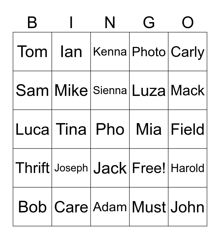 This bingo card has 25 words: Joseph, Adam, Sienna, Bob, Carly, Tom, Sam, Ian, Mia, Jack, Luza, Luca, Free!, Harold, Mike, John, Field, Kenna, Mack, Tina, Pho, Care, Thrift, Photo and Must.