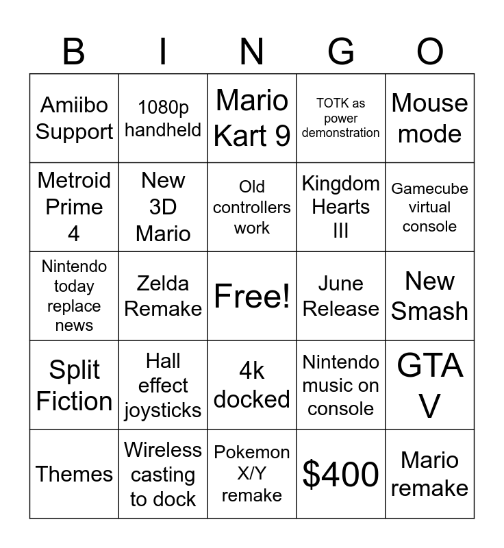 This bingo card has a free space and 24 words: Hall effect joysticks, Wireless casting to dock, Old controllers work, Themes, Mouse mode, Amiibo Support, Metroid Prime 4, 1080p handheld, June Release, 4k docked, Kingdom Hearts III, Nintendo today replace news, Nintendo music on console, GTA V, New 3D Mario, $400, New Smash, Mario Kart 9, Gamecube virtual console, Zelda Remake, Mario remake, Split Fiction, TOTK as power demonstration and Pokemon X/Y remake.