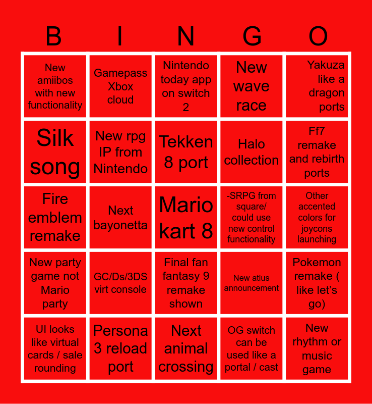 This bingo card has a free space and 24 words: GC/Ds/3DS virt console, Persona 3 reload port, Tekken 8 port, UI looks like virtual cards / sale rounding, Yakuza like a dragon ports, New amiibos with new functionality, Silk song, Gamepass Xbox cloud, -SRPG from square/ could use new control functionality, Final fan fantasy 9 remake shown, Halo collection, Fire emblem remake, New atlus announcement, Pokemon remake ( like let’s go), New rpg IP from Nintendo, OG switch can be used like a portal / cast, Other accented colors for joycons launching, Nintendo today app on switch 2, Ff7 remake and rebirth ports, Next bayonetta, New rhythm or music game, New party game not Mario party, New wave race and Next animal crossing.