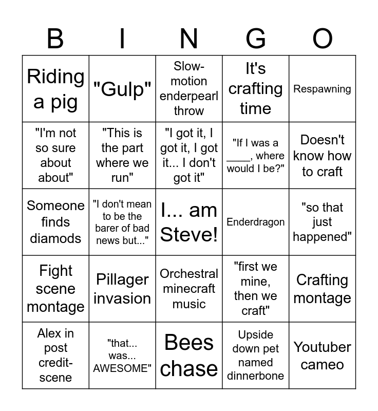 This bingo card has a free space and 44 words: He's behind me, isn't he, Youtuber cameo, Herobrine reference, Alex in post credit-scene, Jack Black sings, Upside down pet named dinnerbone, Slow-motion enderpearl throw, *hears hissing* *turns around*, Respawning, "that... was... AWESOME", It's crafting time, Enderdragon, Orchestral minecraft music, Pillager invasion, Tames a wolf, Bees chase, Someone tries to sleep in the nether, Someone finds diamods, The movie overuses pop songs, Doesn't know how to craft, "Gulp", "Uh Oh", Some complex redstone contraption, Riding a pig, Pet dog dies, "so that just happened", Looks Enderman in the eyes, Curse word turned into Minecraft pun, "first we mine, then we craft", Fight scene montage, "are you thinking what I'm thinking", Crafting montage, Pre-battle preparations montage, "Let's get outta her", "I don't mean to be the barer of bad news but...", Breaks fourth wall, "hey guys, come check this out", "it's quiet, too quiet", "I got it, I got it, I got it... I don't got it", "I'm not so sure about about", "If I was a ____, where would I be?", "____ is my middle name", "This is the part where we run" and Mentions an achievement.