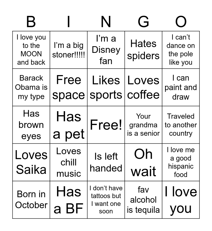 This bingo card has a free space and 25 words: Loves Saika, Has a BF, I don’t have tattoos but I want one soon, fav alcohol is tequila, I can’t dance on the pole like you, I love you to the MOON and back, I’m a big stoner!!!!!, I’m a Disney fan, Your grandma is a senior, I love me a good hispanic food, Barack Obama is my type, Free space, Do you really think this is true?, Oh wait, I can paint and draw, Born in October, Has a pet, Likes sports, Loves coffee, Traveled to another country, Has brown eyes, Loves chill music, Is left handed, Hates spiders and I love you.