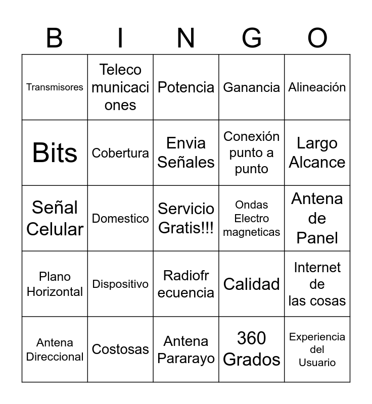 This bingo card has a free space and 24 words: Antena Direccional, Dispositivo, Envia Señales, 360 Grados, Alineación, Transmisores, Teleco municaci ones, Potencia, Ondas Electro magneticas, Antena de Panel, Señal Celular, Cobertura, Calidad, Internet de las cosas, Bits, Costosas, Antena Pararayo, Ganancia, Largo Alcance, Plano Horizontal, Domestico, Radiofr ecuencia, Conexión punto a punto and Experiencia del Usuario.