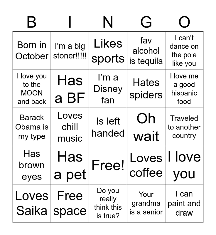 This bingo card has 26 words: Free!, Loves Saika, Has a BF, I don’t have tattoos but I want one soon, fav alcohol is tequila, I can’t dance on the pole like you, I love you to the MOON and back, I’m a big stoner!!!!!, I’m a Disney fan, Your grandma is a senior, I love me a good hispanic food, Barack Obama is my type, Free space, Do you really think this is true?, Oh wait, I can paint and draw, Born in October, Has a pet, Likes sports, Loves coffee, Traveled to another country, Has brown eyes, Loves chill music, Is left handed, Hates spiders and I love you.