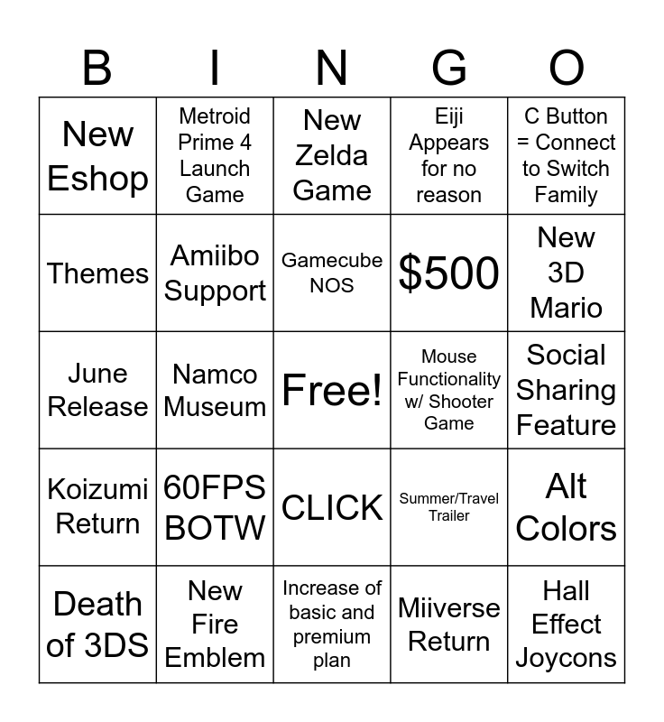 This bingo card has a free space and 24 words: 60FPS BOTW, New Fire Emblem, Gamecube NOS, Death of 3DS, C Button = Connect to Switch Family, New Eshop, Themes, Metroid Prime 4 Launch Game, Mouse Functionality w/ Shooter Game, CLICK, $500, June Release, Summer/Travel Trailer, Alt Colors, Amiibo Support, Miiverse Return, Social Sharing Feature, New Zelda Game, New 3D Mario, Namco Museum, Hall Effect Joycons, Koizumi Return, Eiji Appears for no reason and Increase of basic and premium plan.