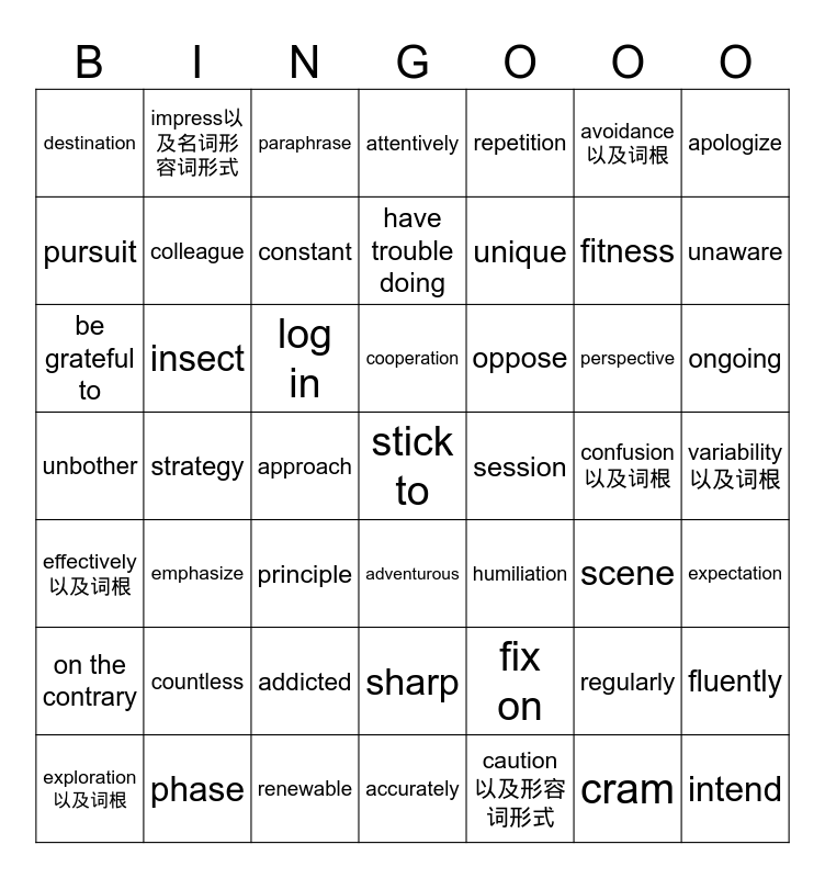 This bingo card has 119 words: convince, struggle, humiliation, eventually, bully, overwhelm, attentively, interrupt, poetically, countless, trap, advanced, despite, reserve, transition, renewable, cooperation, scale, demonstration, expertise, ongoing, paraphrase, breeze, lean, hold sb's breath, insect, unbother, scene, overlook, productive, constant, pursuit, unique, obviously, fluently, bend, attach, rely, fix on, entertainment, presence, satisfaction, exploration以及词根, existence以及词根, sharp, fond, unaware, approach, trick, strategy, reward, oppose, addicted, expose, convey, transform, break away from, adapt to, purchase, principle, expectation, appreciation, sympathy, discover, raise, apologize, brush, adventurous, colleague, have trouble doing, adjust, be grateful to, stay energetic, be based on, tiredness, regularly, stick to, fitness, log in, destination, in person, adventure, effectively以及词根, maximize, potential, partnership, in terms of, enthusiasm以及形容词形式, impress以及名词形容词形式, domestic, intend, cram, on the contrary, stability以及形容词形式, variability以及词根, effectiveness, repetition, associative以及动词名词形式, condition, significant, occur, accurately, session, factor, absolute, coincidence, indication以及词根, confusion以及词根, phase, current, consumption以及词根, avoidance以及词根, indifferent, emphasize, existing以及词根, standard, caution以及形容词形式, perspective and occasionally.