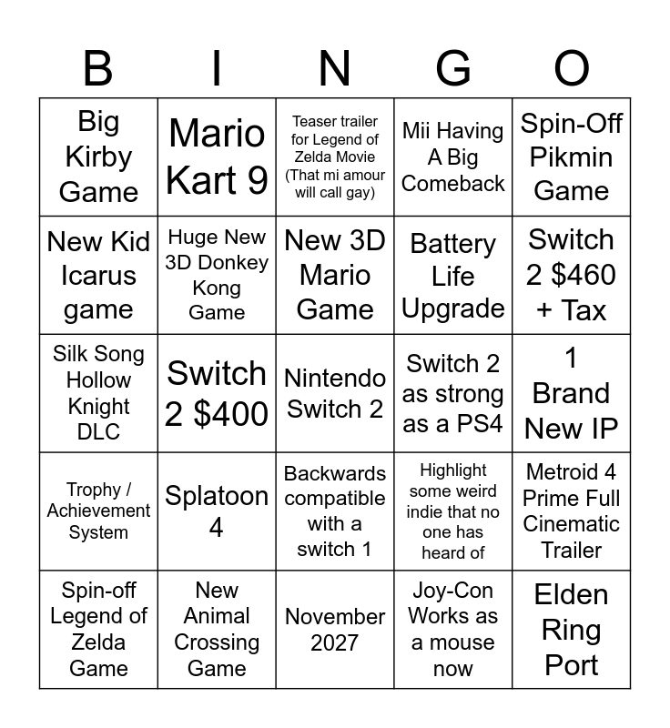 This bingo card has a free space and 24 words: Splatoon 4, New Animal Crossing Game, New 3D Mario Game, Spin-off Legend of Zelda Game, Spin-Off Pikmin Game, Big Kirby Game, New Kid Icarus game, Mario Kart 9, Switch 2 as strong as a PS4, Backwards compatible with a switch 1, Battery Life Upgrade, Silk Song Hollow Knight DLC, Highlight some weird indie that no one has heard of, Metroid 4 Prime Full Cinematic Trailer, Huge New 3D Donkey Kong Game, Joy-Con Works as a mouse now, 1 Brand New IP, Teaser trailer for Legend of Zelda Movie (That mi amour will call gay), Switch 2 $460 + Tax, Switch 2 $400, Elden Ring Port, Trophy / Achievement System, Mii Having A Big Comeback and November 2027.