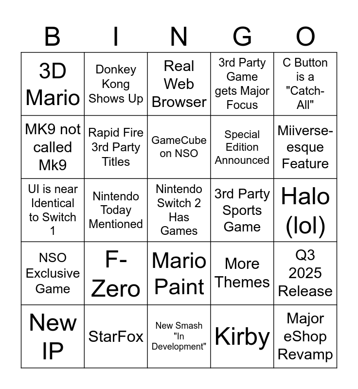 This bingo card has a free space and 24 words: F-Zero, StarFox, GameCube on NSO, New IP, C Button is a "Catch-All", 3D Mario, MK9 not called Mk9, Donkey Kong Shows Up, 3rd Party Sports Game, Mario Paint, Special Edition Announced, UI is near Identical to Switch 1, More Themes, Q3 2025 Release, Rapid Fire 3rd Party Titles, Kirby, Halo (lol), Real Web Browser, Miiverse-esque Feature, Nintendo Today Mentioned, Major eShop Revamp, NSO Exclusive Game, 3rd Party Game gets Major Focus and New Smash "In Development".