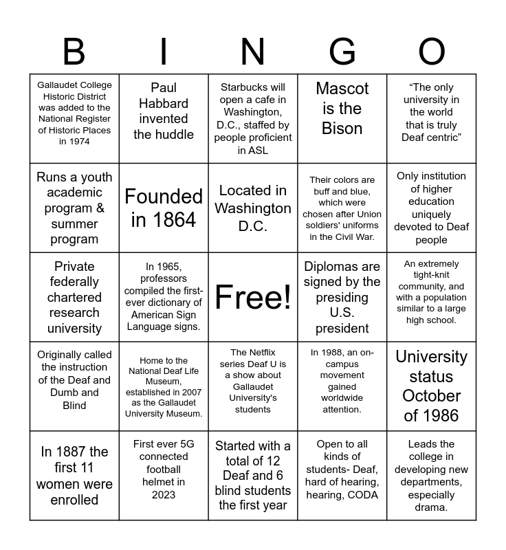 This bingo card has a free space and 27 words: Where Deaf President Now protest took place in 1894, First ever 5G connected football helmet in 2023, Located in Washington D.C., Open to all kinds of students- Deaf, hard of hearing, hearing, CODA, “The only university in the world that is truly Deaf centric”, Runs a youth academic program & summer program, Paul Habbard invented the huddle, Started with a total of 12 Deaf and 6 blind students the first year, Diplomas are signed by the presiding U.S. president, University status October of 1986, Originally called the instruction of the Deaf and Dumb and Blind, Founded in 1864, In 1988, an on-campus movement gained worldwide attention., Leads the college in developing new departments, especially drama., Private federally chartered research university, Open architecture is based on lines of sight, Starbucks will open a cafe in Washington, D.C., staffed by people proficient in ASL, Mascot is the Bison, An extremely tight-knit community, and with a population similar to a large high school., Gallaudet College Historic District was added to the National Register of Historic Places in 1974, Home to the National Deaf Life Museum, established in 2007 as the Gallaudet University Museum., The Netflix series Deaf U is a show about Gallaudet University's students, Their colors are buff and blue, which were chosen after Union soldiers' uniforms in the Civil War., Only institution of higher education uniquely devoted to Deaf people, In 1887 the first 11 women were enrolled, In 1965, professors compiled the first-ever dictionary of American Sign Language signs. and April 8th Charter Day, commemorating the official founding of the university..